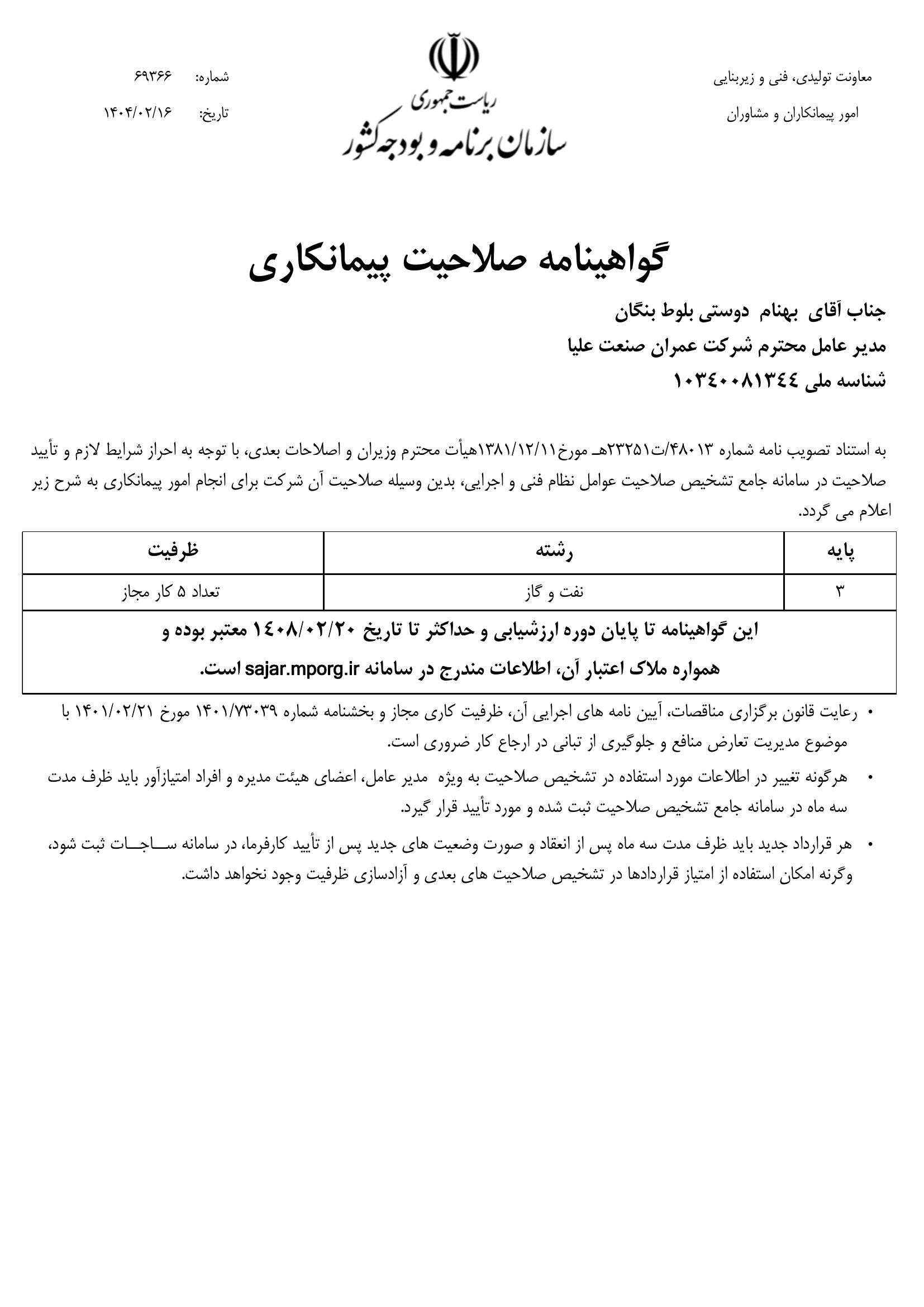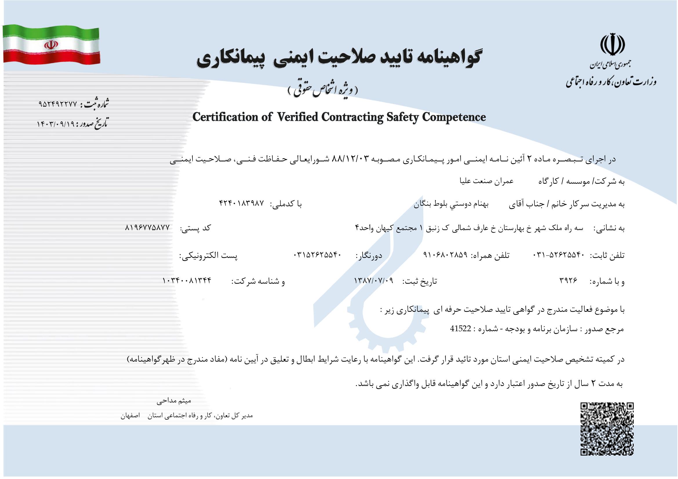 Client Satisfaction Certificate, Construction of Third Distillation Unit, Isfahan Refinery